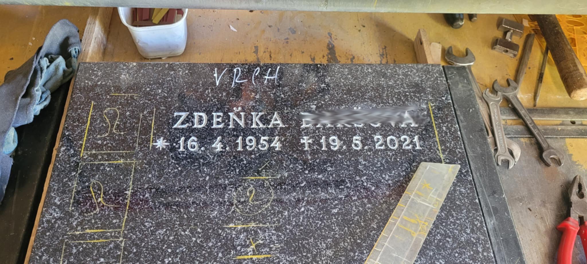 Práce v dílně se provádí většinou na deskách které jsou na hřbitově volně ložené a dá se s nimi manipulovat a na hřbitově jsou těžko přístupné, případně na nové pomníky. Tady pak práci provádíme v kombinaci se strojem a ruční prací dlátem – vše dle provedení původních nápisů a přání zákazníka.